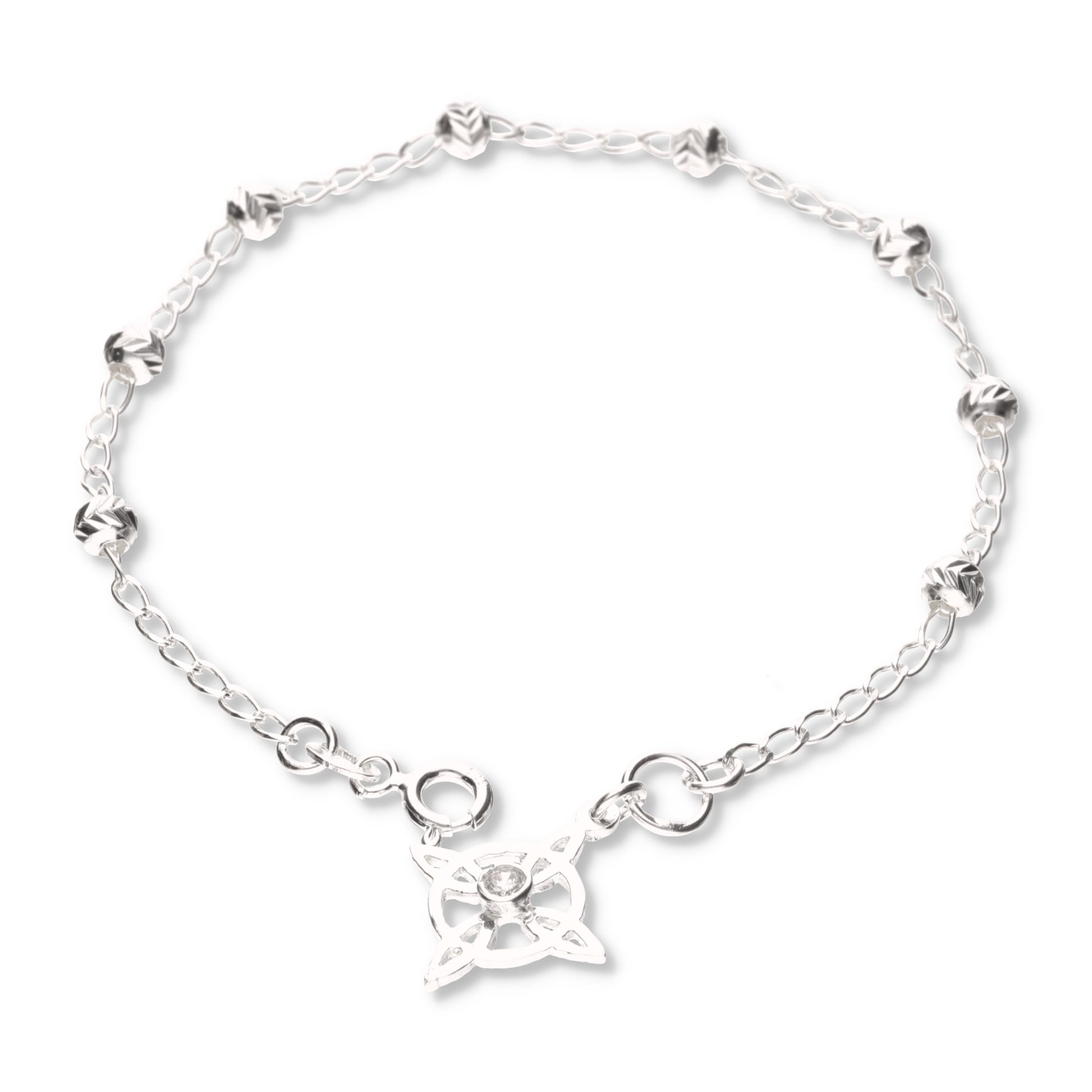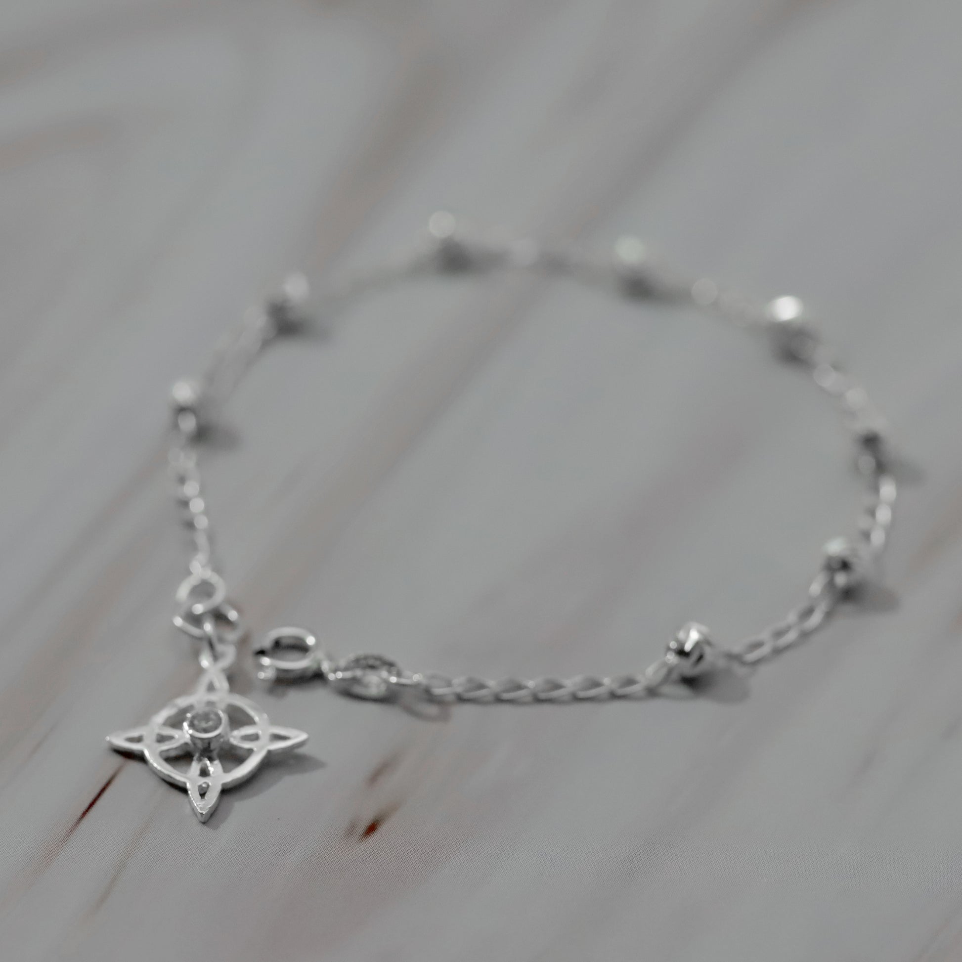 Pulsera con dije de Nudo de Bruja con circonia con Bolitas tipo Moon Cut de Plata 925.