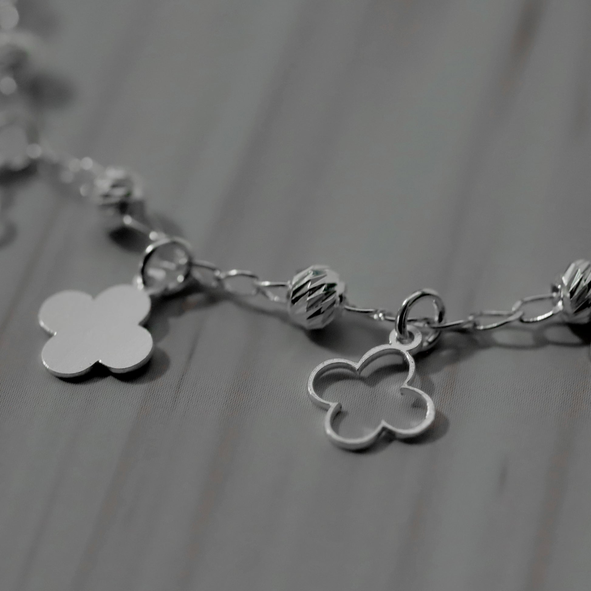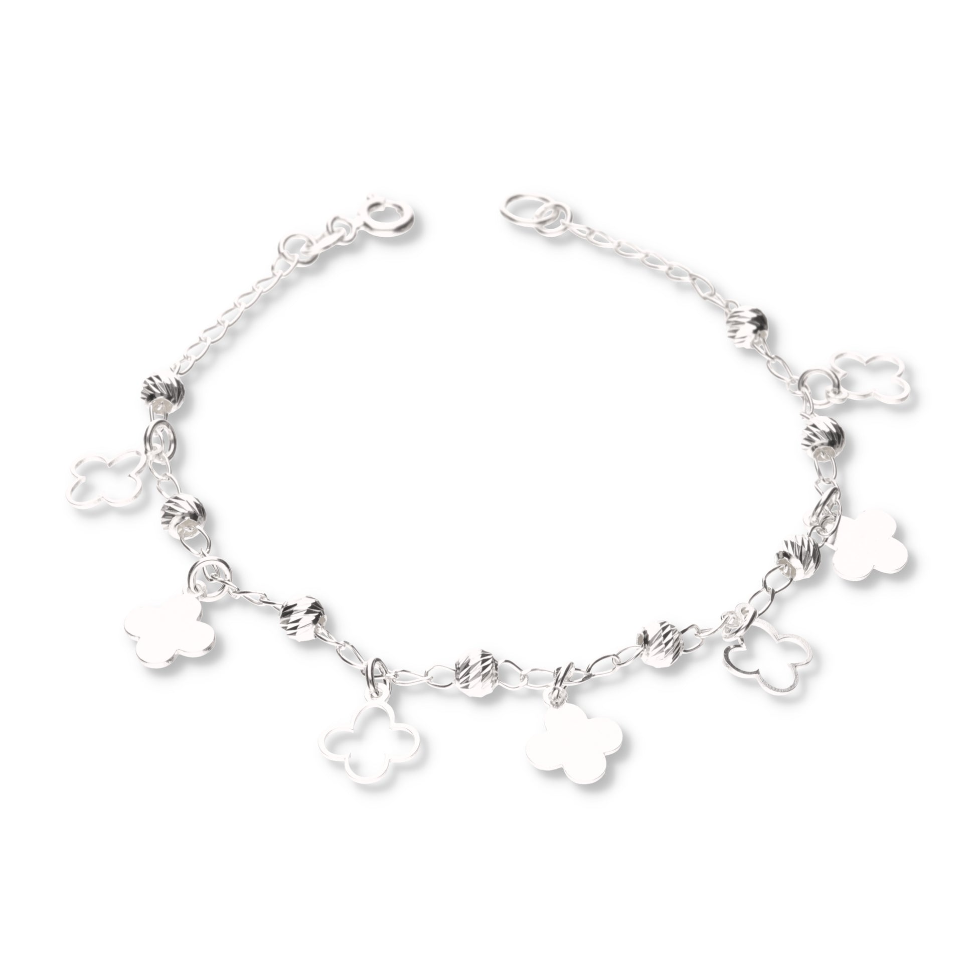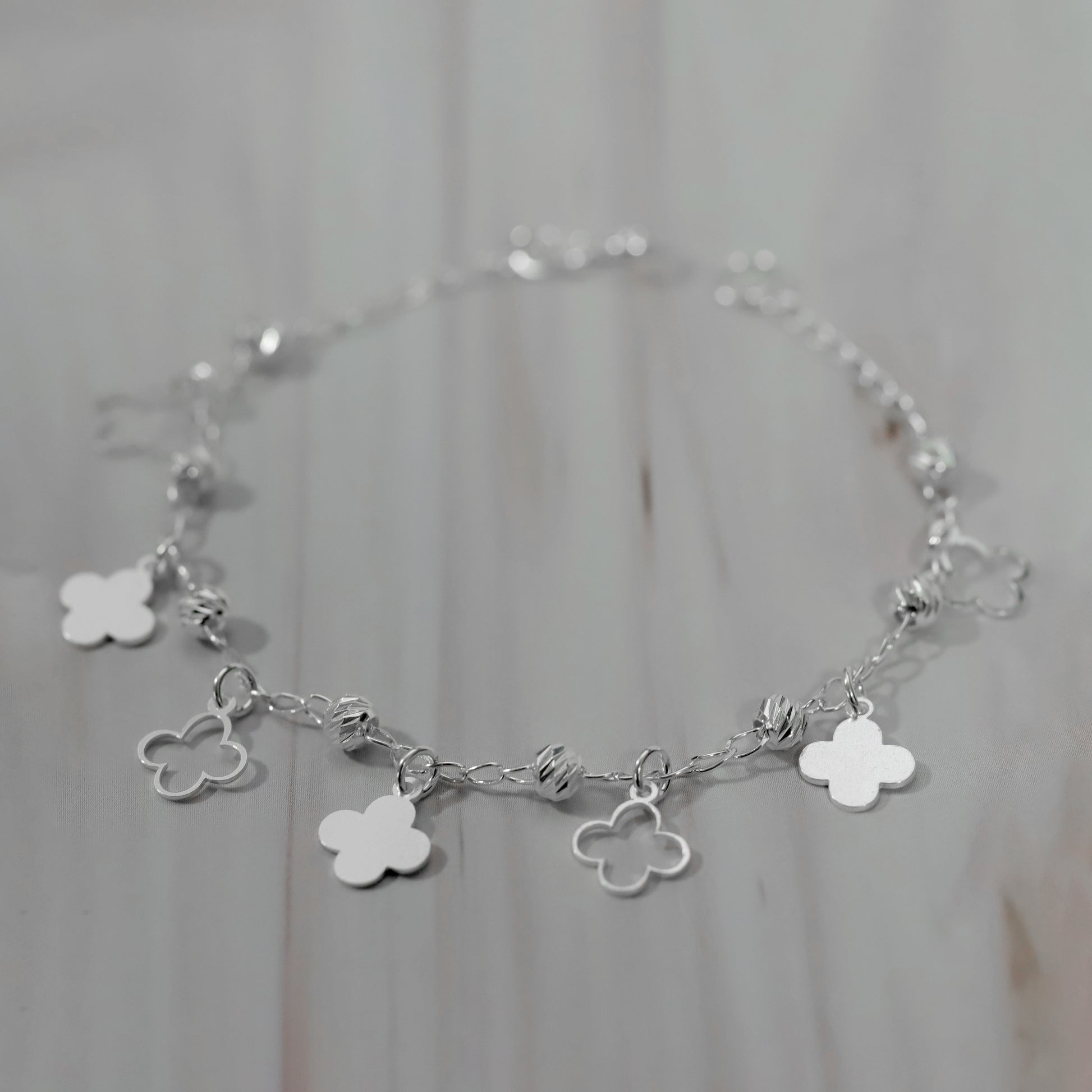 Pulsera de Tréboles laminados con Bolitas tipo Slash en Plata 925.